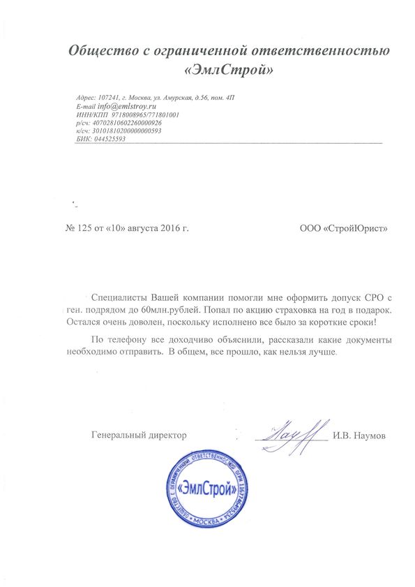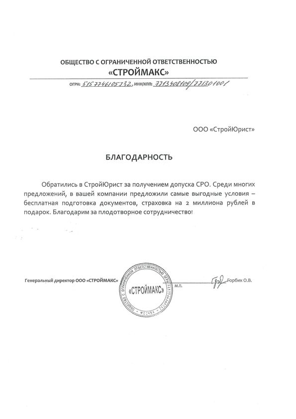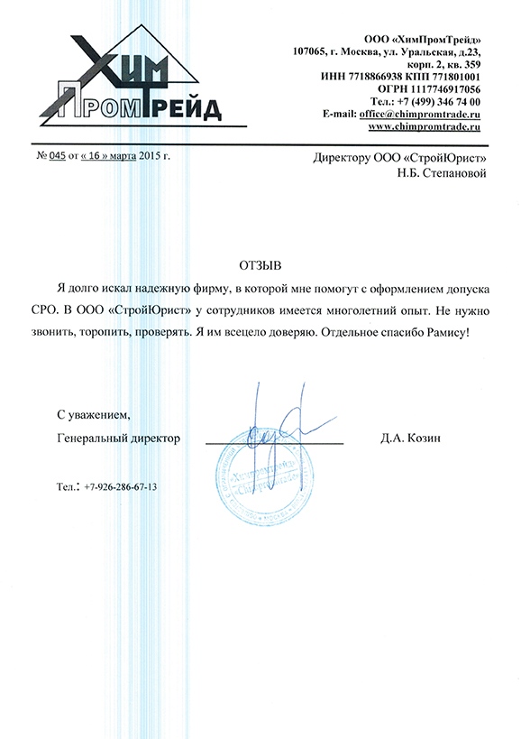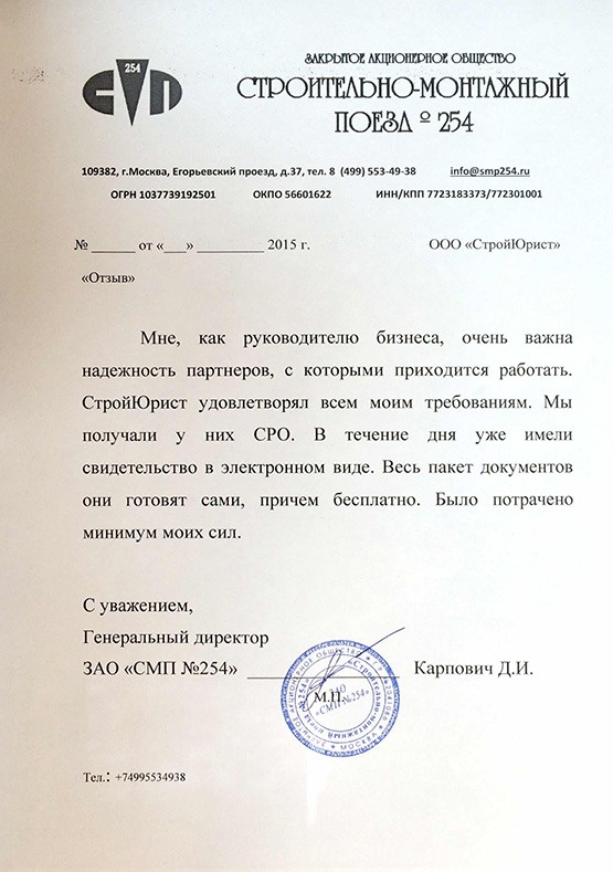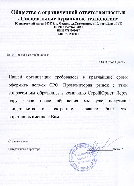 Отзывы клиентов "СтройЮрист" по вступлению в СРО в Люберцах