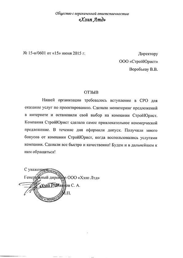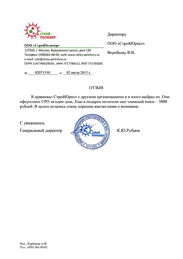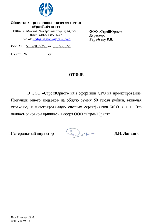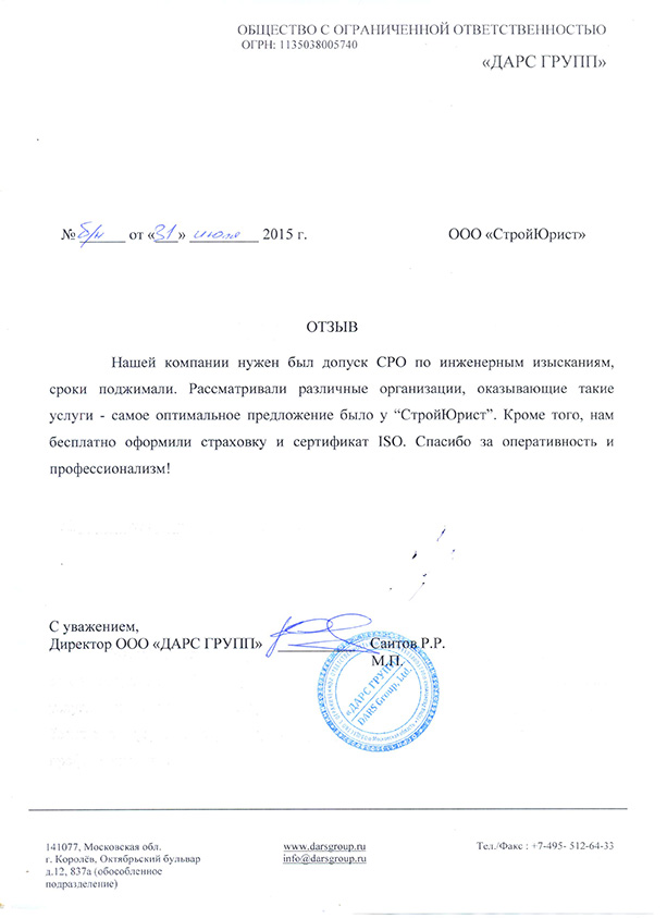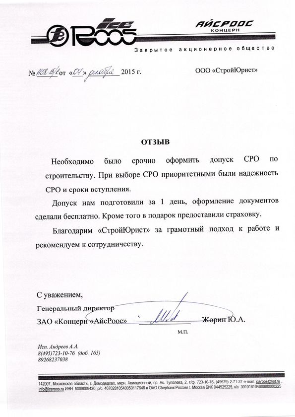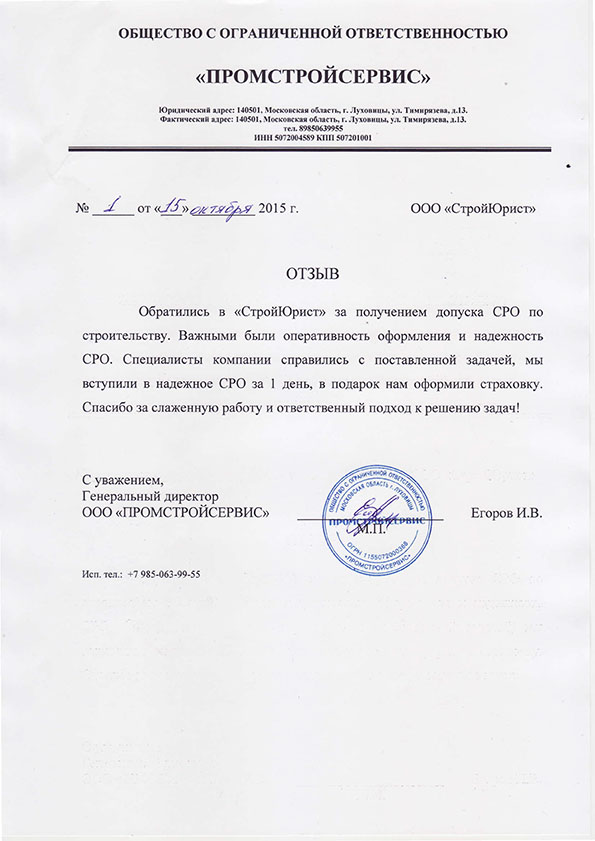Отзывы клиентов "СтройЮрист" по вступлению в СРО в Люберцах