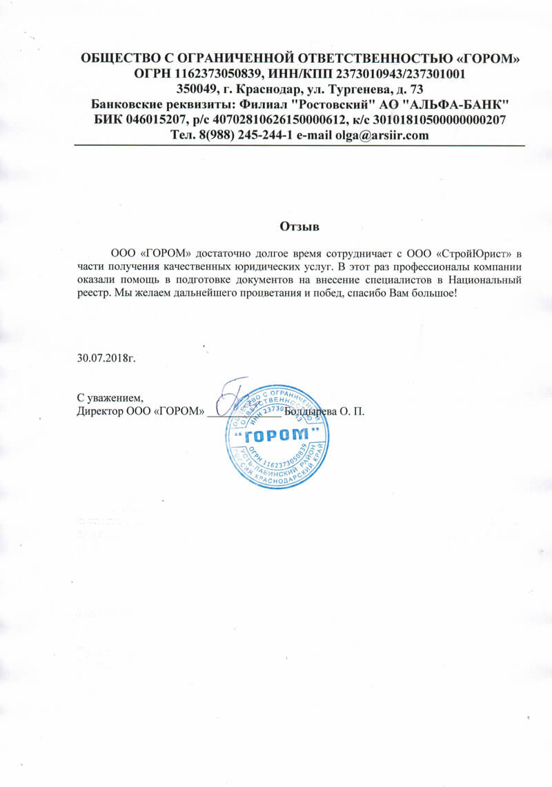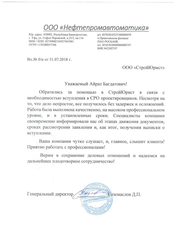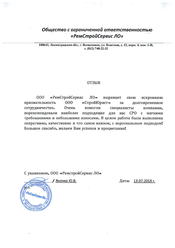 Отзывы клиентов "СтройЮрист" по вступлению в СРО в Люберцах